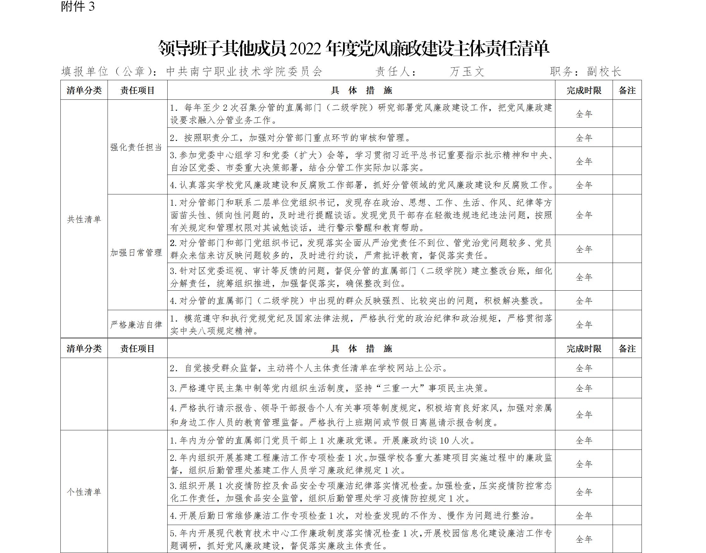 領導班子其他成員2022年度黨風廉政建設主體責任清單